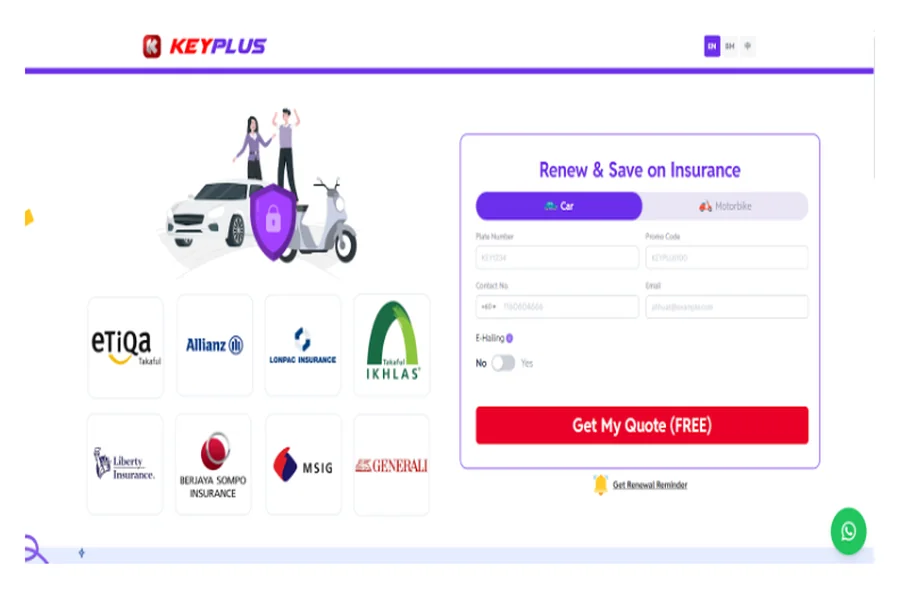 Key Plus is a Malaysian-based digital car insurance comparison and renewal platform. By partnering with multiple licensed insurers, Key Plus allows users to compare quotes instantly, choose coverage that fits their needs, and enjoy flexible payment options offered by third-party partners, such as instalments up to 12 months. Designed for everyday Malaysians, Key Plus focuses on transparency, affordability, and convenience. Making car insurance easier, smarter, and more accessible for everyone.
